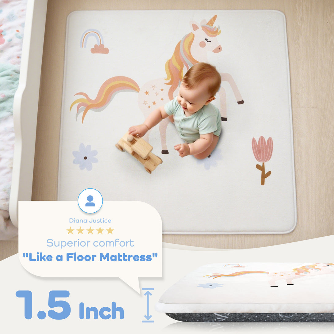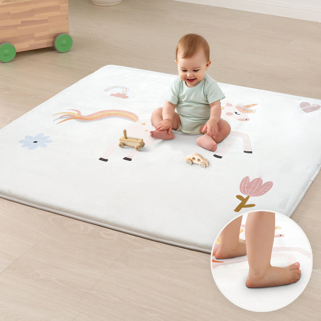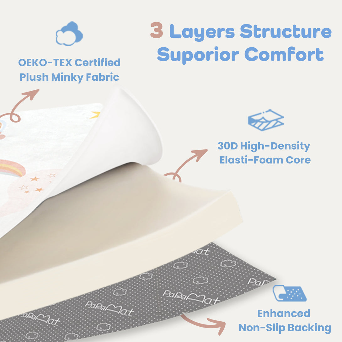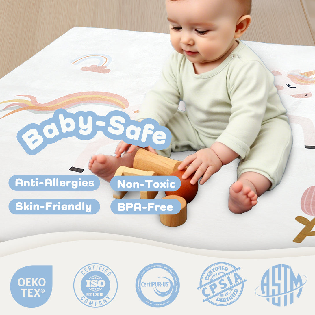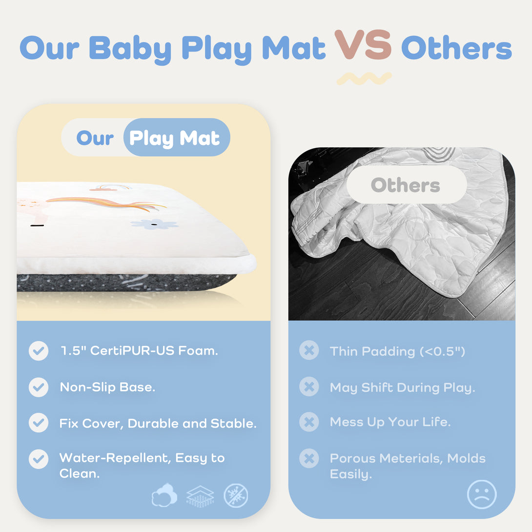 This seems like a good quality play mat. It arrived packaged well, and as soon as I opened it from the vacuum sealed bag, it expanded in about two hours. The construction is good. The foam is very soft but supportive. The material covering is nice and taut. It is made of a very soft plush material that's very soft but also got dirty really quickly. It wipes clean and I was able to vacuum it, but I suspect we'll have to see how well it holds up long term or if it gets really stained. An unexpected benefit of this was that my elder dog absolutely loves this play mat. Whenever my kiddo is not on it, my dog can be found snuggled up in a ball. So two for one!There was no odor to the mat, which was another benefit.